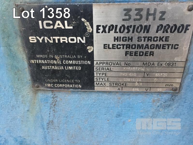 VIBRATING FEEDER, ICAL SYNTRON TYPE: FVD650 ELECTROMAGNETIC DRIVE 33HZ, 415V, EXPLOSION PROOF, HIGH STROKE (LOCATED REGENCY ROAD, FERRYDEN PARK SA)