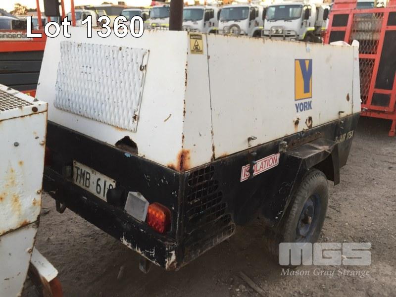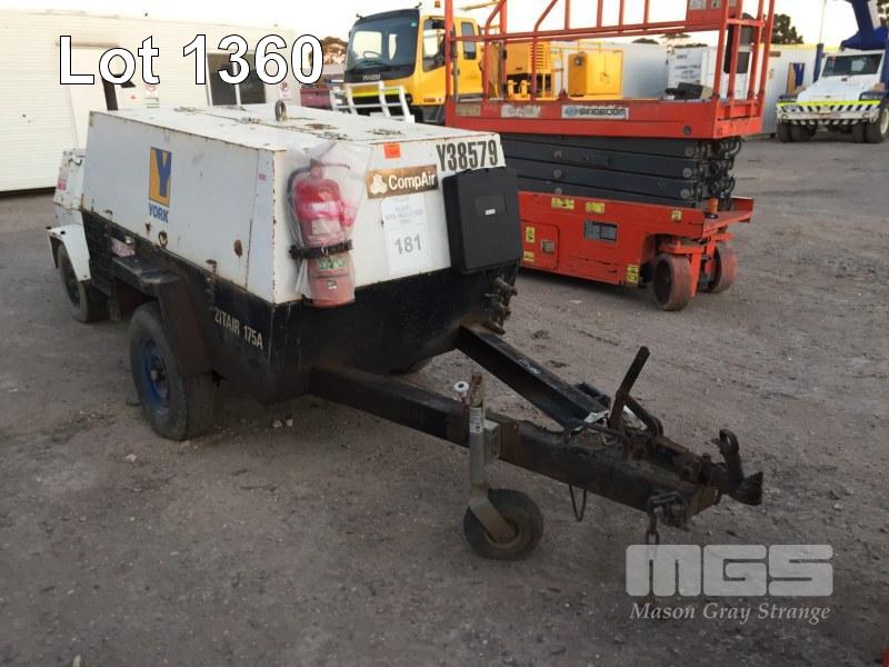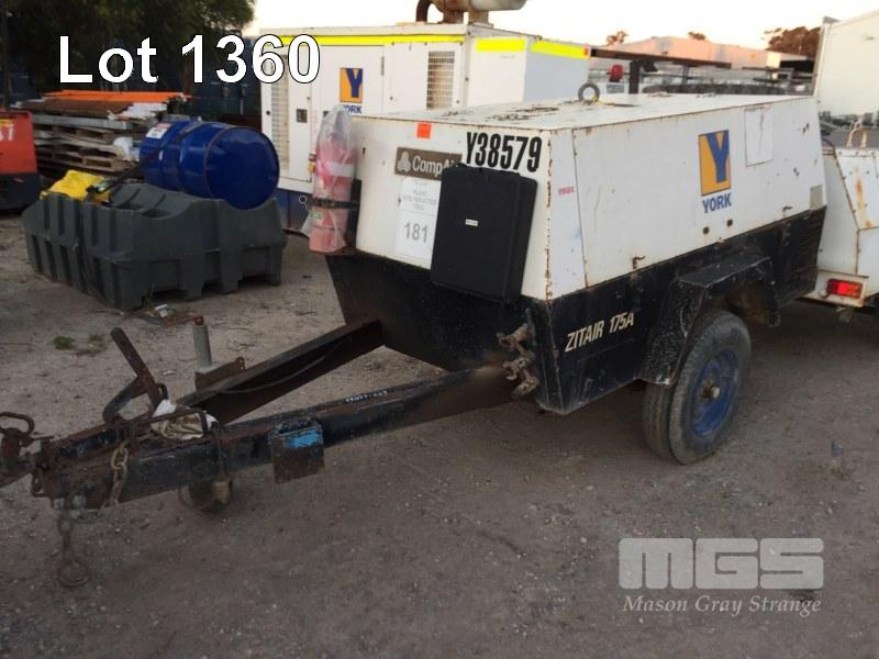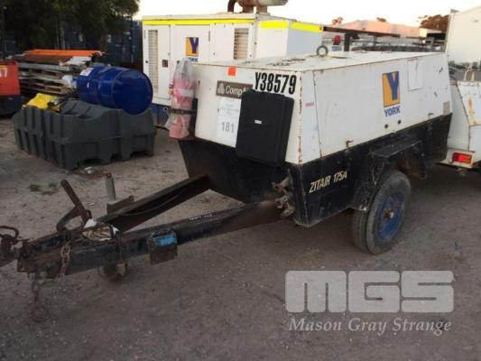 TRAILER AIR COMPRESSOR, COMPAIR ZITAIR 175A TYPE: Z175A DOM: 4/90 S/NO: 177 REG: TMB 618 POWERED BY KIKI 4 CYLINDER DIESEL ENGINE HOURS: 3,858 SHOWING PLANT NO: Y38579 ON SINGLE AXLE TRAILER REG: TMB 618 (SA) BALL HITCH, BRAKES WITH PAPERS (LOCATED REGENCY ROAD, FERRYDEN PARK SA)