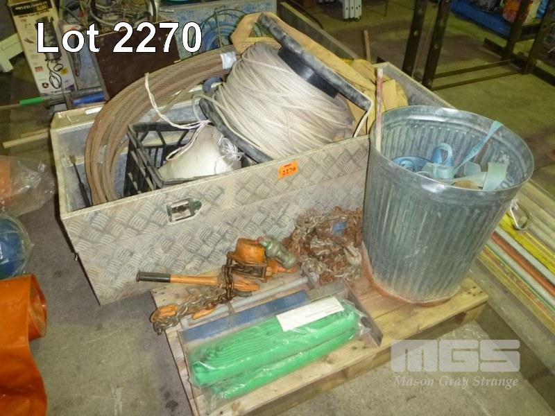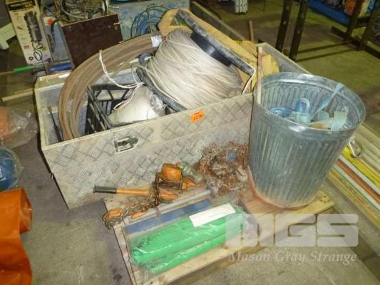 PALLET LOT:- ASSORTED LIFTING GEAR, CHAIN, ROPES, COME ALONG, NEW SLINGS, SHACKLES, ALLOY TOOLBOX, WIRE ROPE