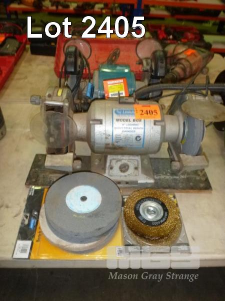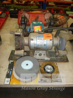 2 x DE BENCH GRINDERS, 8", (1 x ALL FAULTS) WITH SPARE WHEELS & BRUSHES
