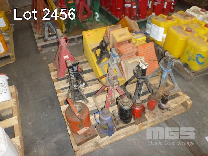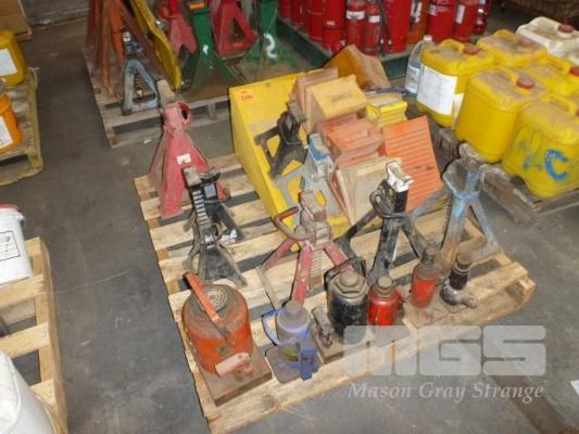 6 x BOTTLE JACKS, 1-50T, 8 x AXLE STANDS & ASSORTED CHOCKS