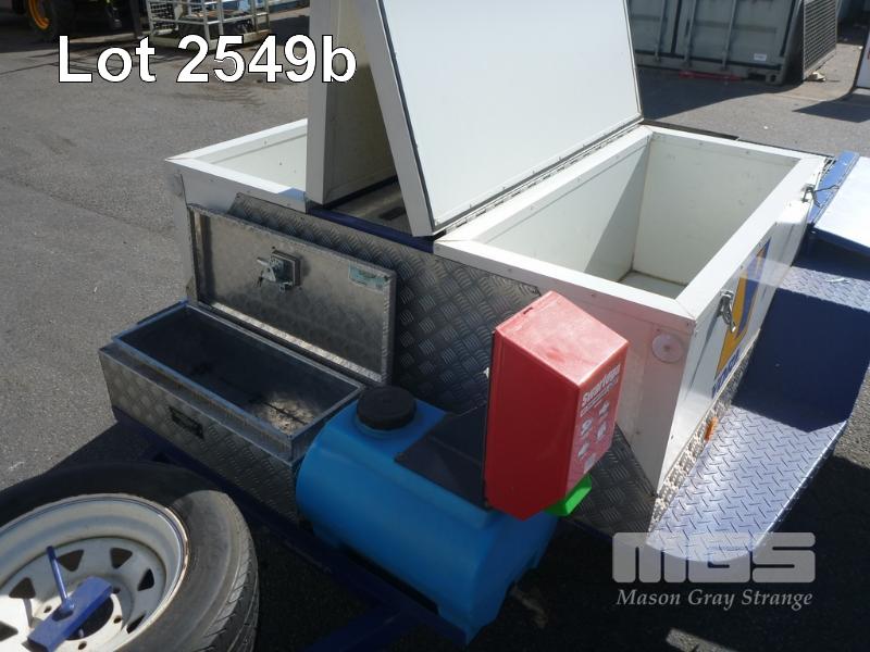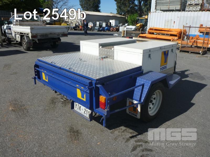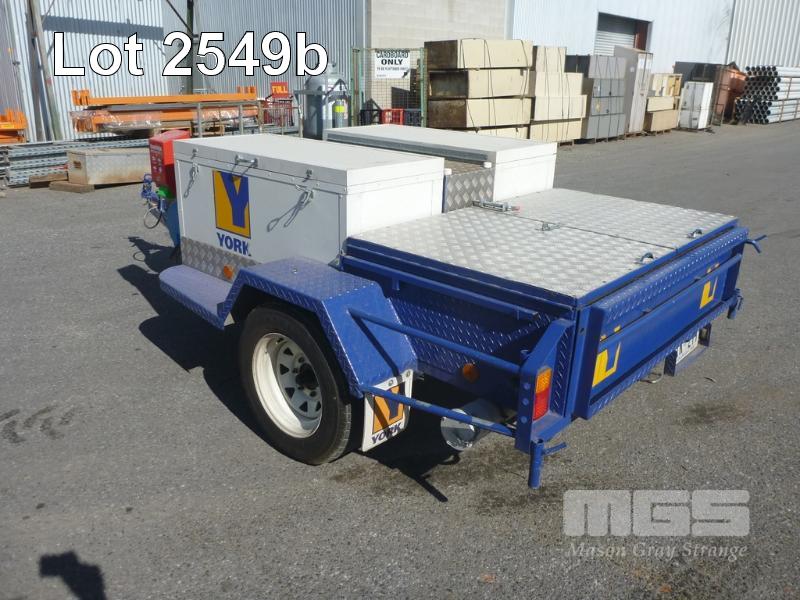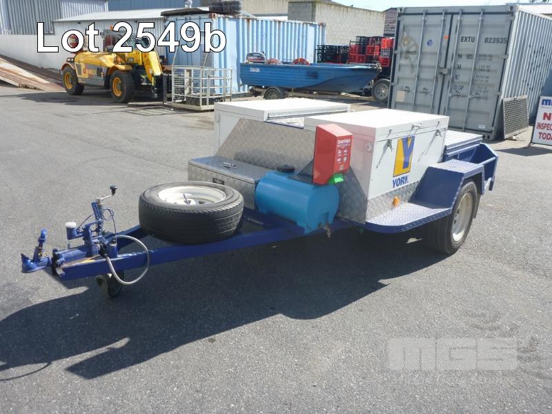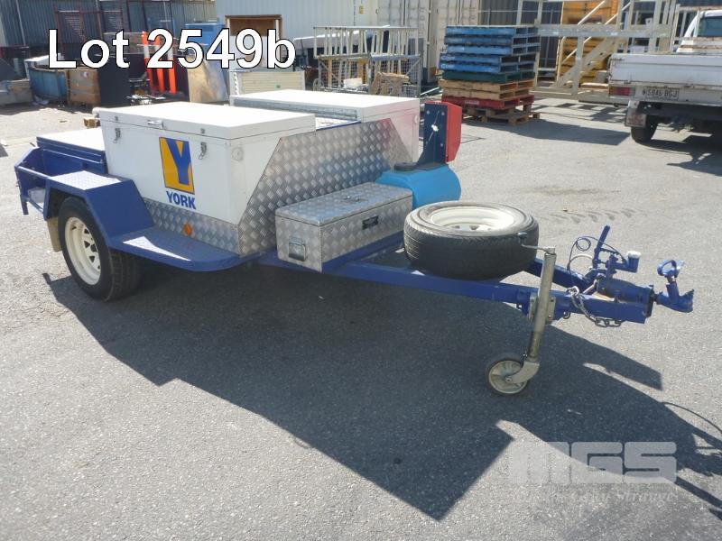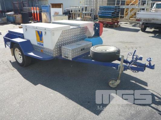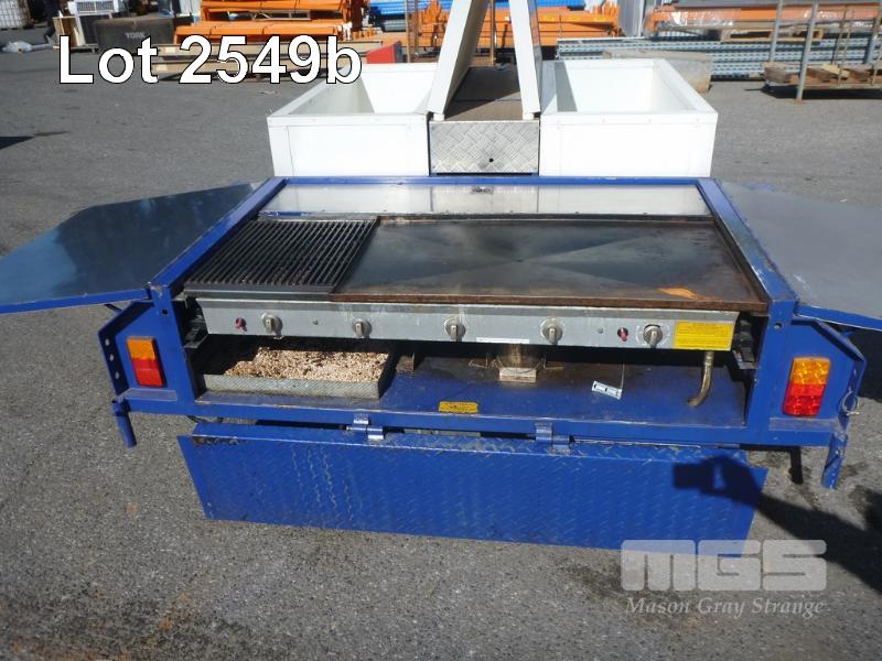 BBQ TRAILER, 5 BURNER HOTPLATE & GRILL, LPG 2 x COOLER BOXES, TOOL BOX WASH TANK & SOAP DISPENSER MOUNTED ON 2008 MIEGEL BROS 7x5' SINGLE AXLE TRAILER REG: YIK 211 (SA) 15" SUNRAYSIA RIMS, SPARE, HYDRAULIC BRAKES, BALL HITCH