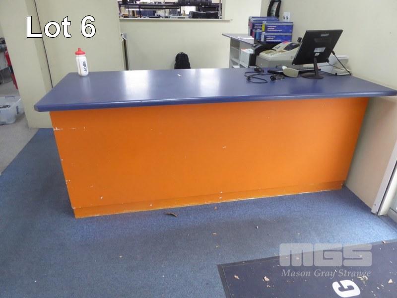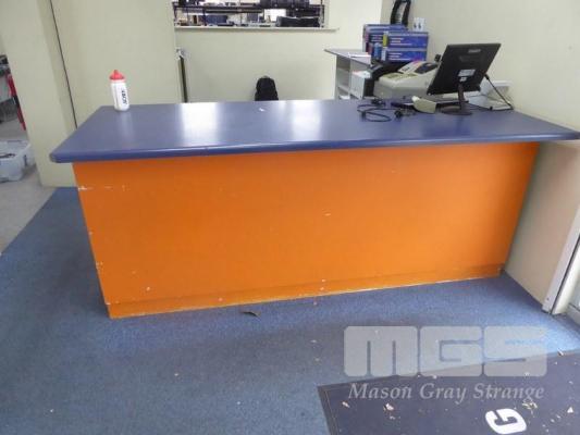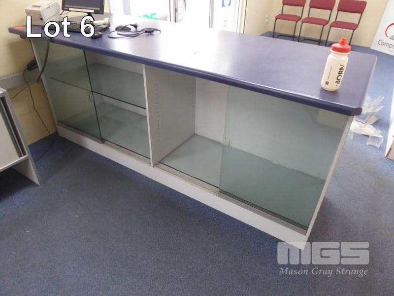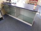 SERVICE COUNTER, TIMBER LAMINATE, 230 x 90cm GLASS SHELF & DOORS