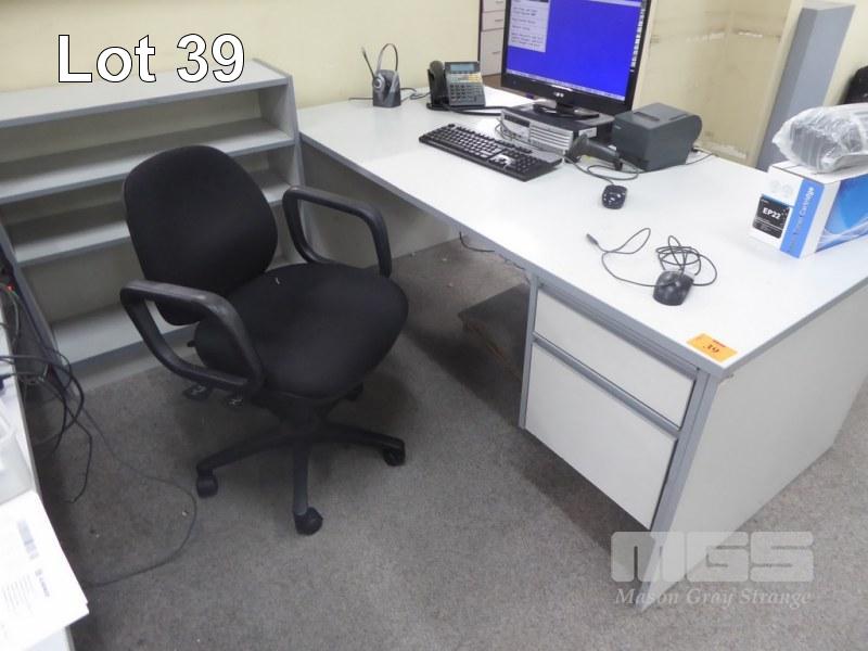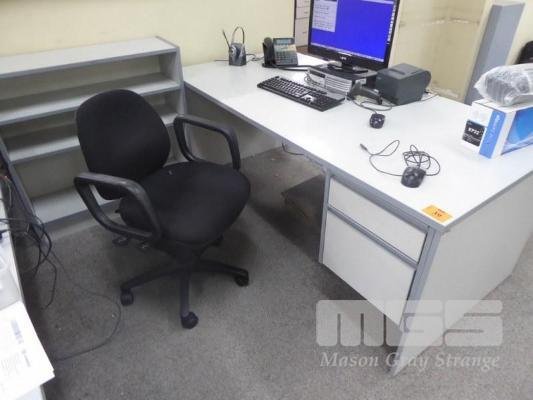 OFFICE DESK, GREY LAMINATE, 180 x 90cm, 2 DRAWER OFFICE CHAIR & LOWLINE BOOKCASE