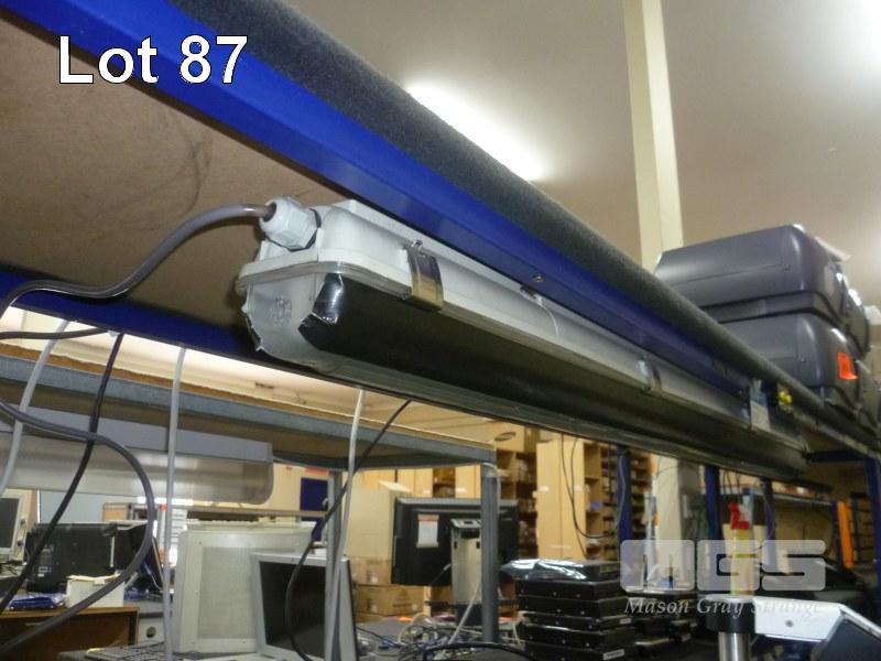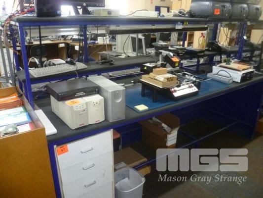 WORKBENCH, STEEL FRAME, TIMBER TOP, CARPETED WITH SHELF, 268 x 90cm WITH 4 DRAWER SET, ANTI-STATIC MAT & FLURO LIGHTING