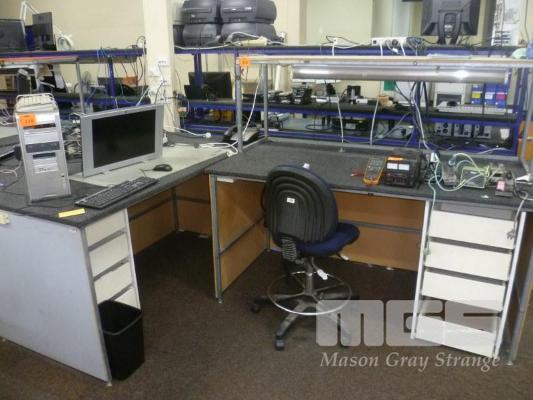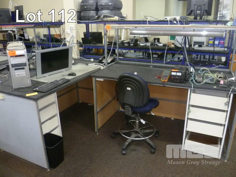 2 x WORKBENCHES, STEEL FRAME, TIMBER TOP, CARPETED WITH 1 x SHELF, FLURO LIGHTING & WORKSTATION CHAIR EACH 180 x 90cm WITH 4 DRAWER SETS