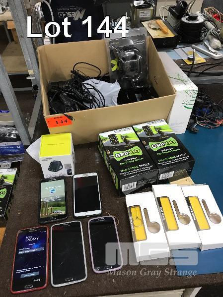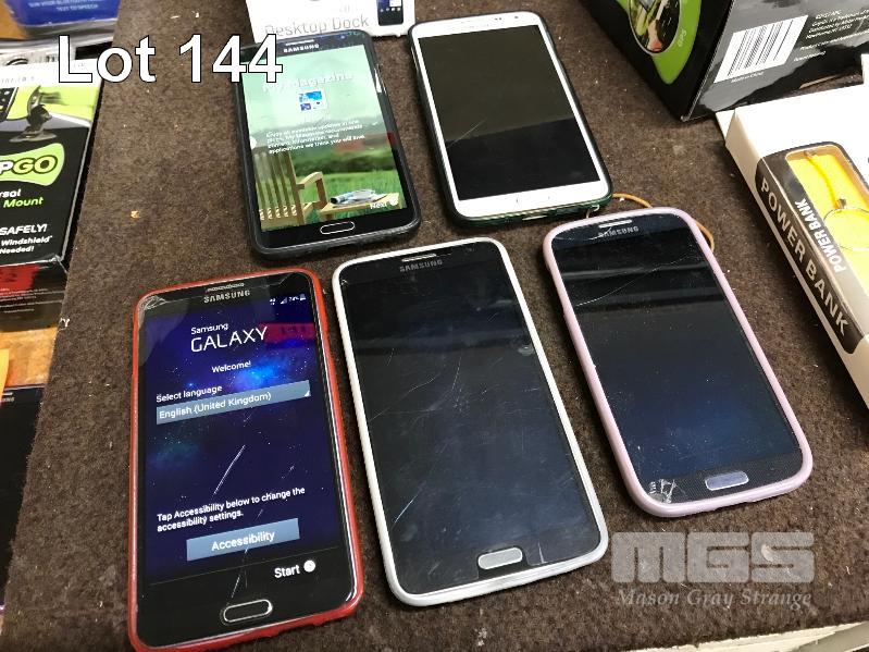 4 x MOBILE PHONES, SAMSUNG GALAXY NOTE 3 LITE, 16GB 1 x MOBILE PHONE, SAMSUNG GALAXY S4 (ALL CRACKED SCREENS) WITH UNIVERSAL CAR MOUNTS, POWERBANKS & ACCESSORIES