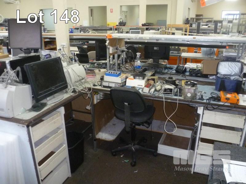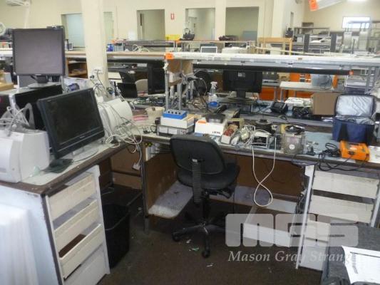 2 x WORKBENCHES, STEEL FRAME, TIMBER TOP, CARPETED WITH 1 x SHELF, FLURO LIGHTING & WORKSTATION CHAIR EACH 180 x 90cm WITH 4 DRAWER SETS