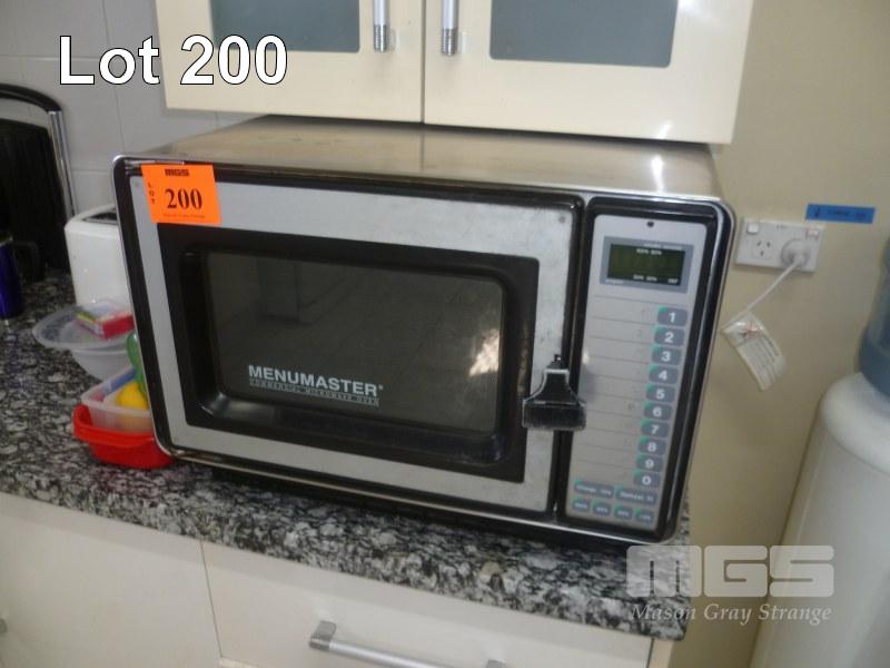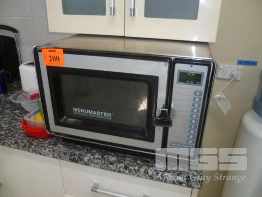 MENUMASTER COMMERCIAL MICROWAVE, MODEL V1600I WITH KITCHEN SUNDRIES INC. TOASTER OVEN, 4 SLICE TOASTER, HOT WATER URN, CROCKERY & GLASSES