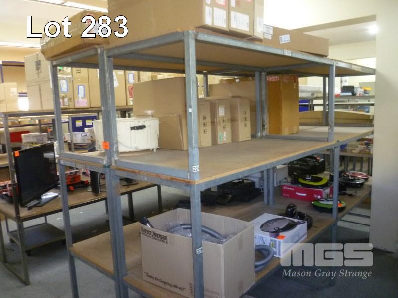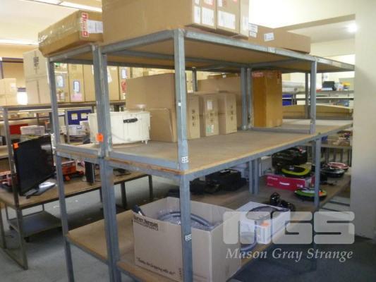 2 x LARGE SHELF UNITS, STEEL FRAME, CHIPBOARD SHELVES, 4.1(L) x 2.3(H) x 0.8m(W)