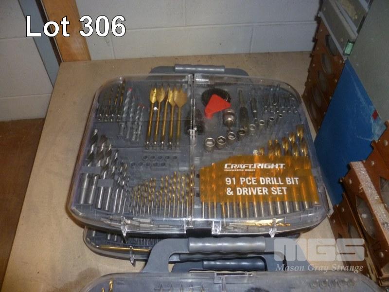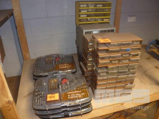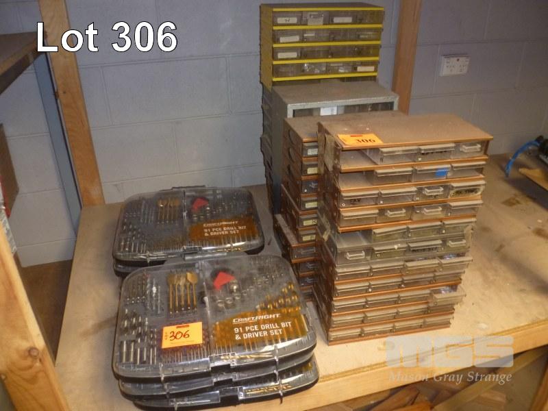 6 x DRILL & BITS SETS, STEEL & TIMBER & 8 x MULTI DRAWER PARTS BINS