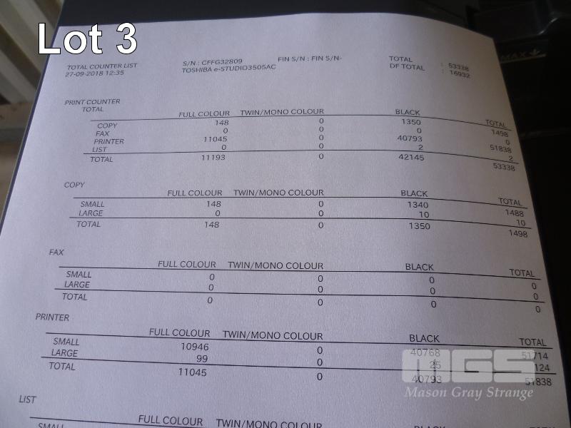 PHOTOCOPIER, TOSHIBA e-STUDIO 3505AC COLOUR DIGITAL, ADF, PRINTER USB & NETWORK PORTS, 11,193 COLOUR & 42,145 B&W COPIES SHOWING (TEST PAGE ATTACHED) S/N:CFFG32809