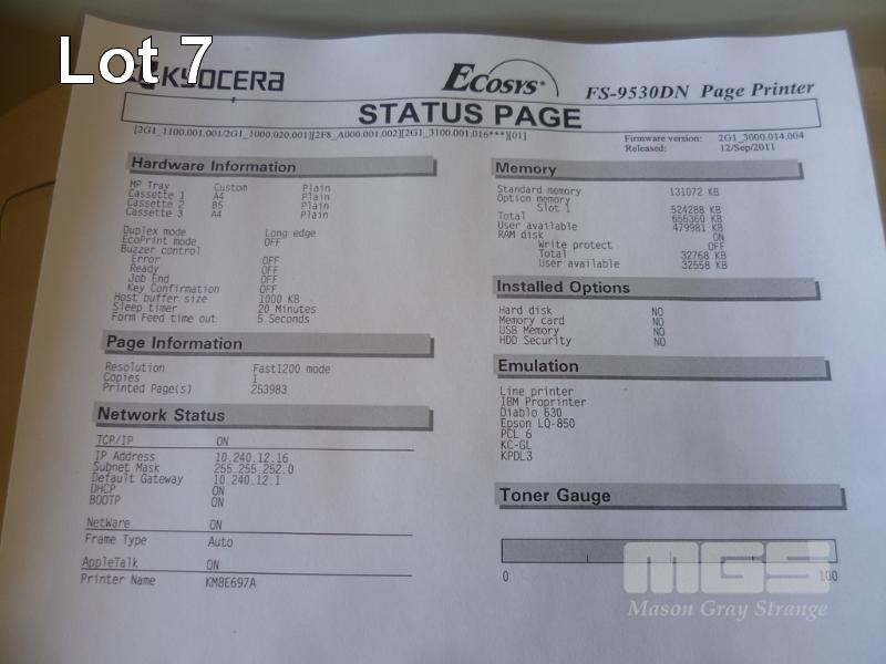 PRINTER, KYOCERA FS-9530DN LASER, USB, NETWORK, 253,983 PAGES (TEST PAGE ATTACHED) S/N:PZH2300440