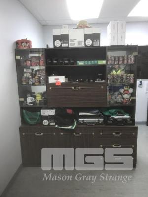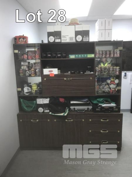 TIMBER LAMINATE WALL UNIT, 176 x 186cm, 2 DOOR, 3 DRAWER, 2 x GLASS DISPLAY SHELVES NOT THE CONTENTS.