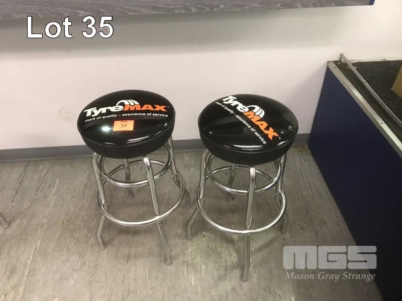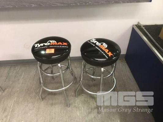 2 x SHOP STOOLS, TYRE MAX, BLACK VINYL, CHROME BASE