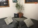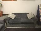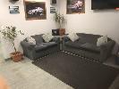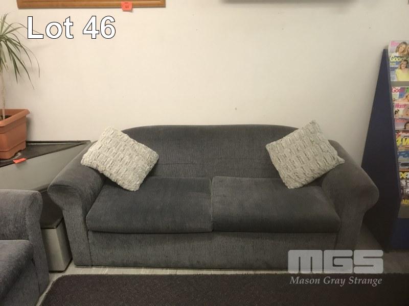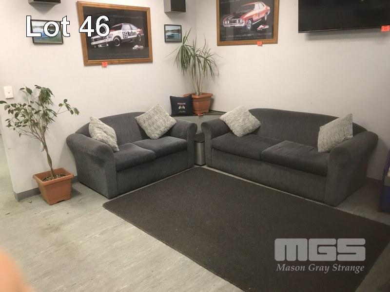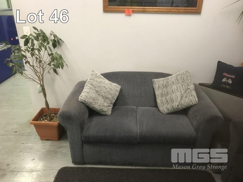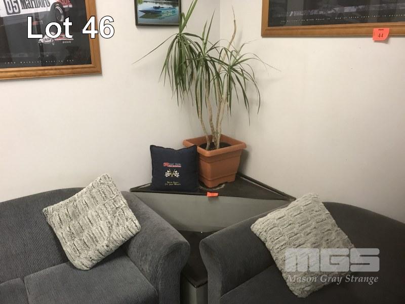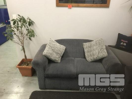 2 x COUCHES & CORNER PIECE, (SEATS 4) GREY FABRIC WITH 2 PLANTS. CUSHIONS & FLOOR MAT