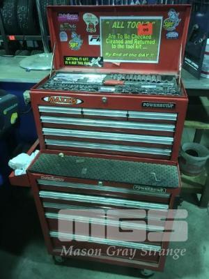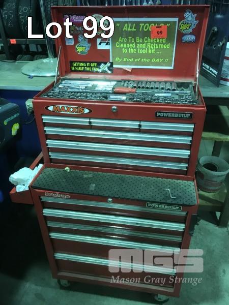POWERBUILT TOOL BOX, 6 DRAWER ON MOBILE 5 DRAWER TROLLEY, INCLUDES SOCKETS SET, KINGCHROME 1/4, 1/2 & 3/8", CHISEL, PUNCHES, SHIFTERS, GRIPS, IMPACT DRIVER