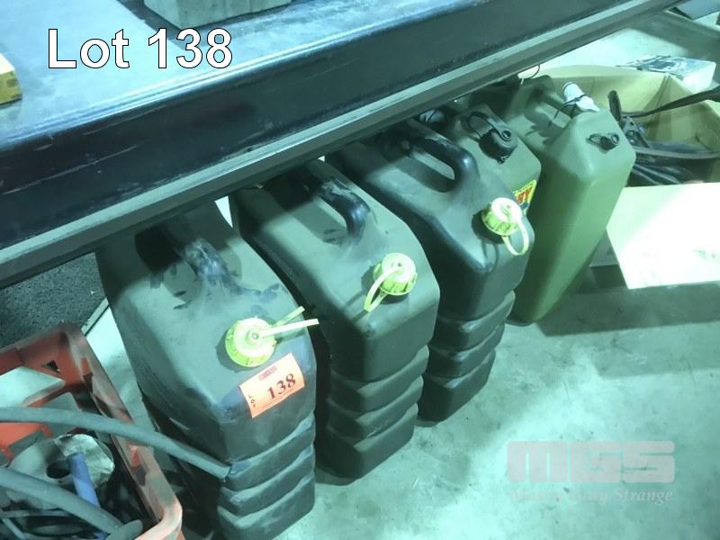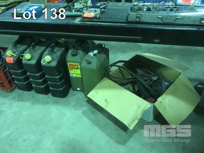 3 x 20 LITRE PLASTIC JERRY CANS, 2 x 20 LITRE PLASTIC WATER CANS, JUMPER LEADS & HOSE