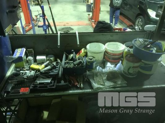 LARGE QUANTITY TYRE REPAIR EQUIPMENT, 3 x DIE GRINDERS, 2 x AIR DRILLS, GLUES, RATCHETS, GUNS, HAND TOOLS, 1/2" IMPACT GUN, GRIPS, PLIERS, AIR GUN & HAMMER