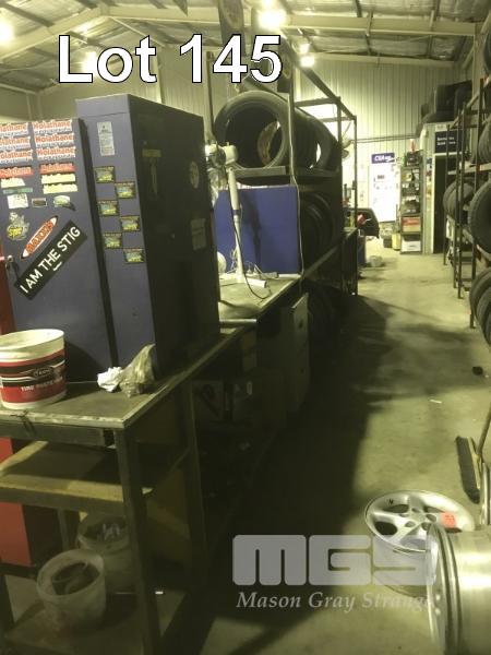 TWIN BENCH AND TYRE RACK, 2.5 x 6.8 x .65m, MULTI TIER & 2 x FILING CABINETS