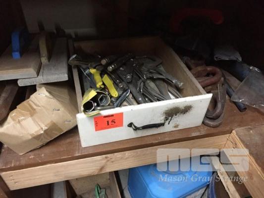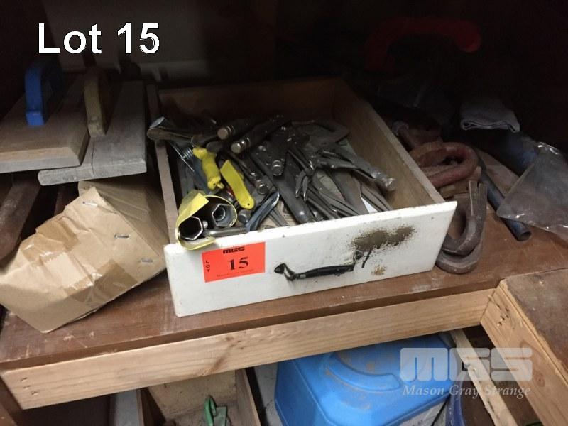 ASSORTED HAND TOOLS, VICE GRIPS, SHEET METAL CUTTER, GREASE GUN, ETC, 1 x SHELF