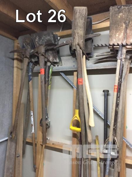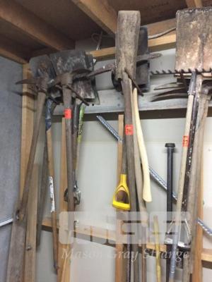 2 x SHOVELS, PICK, 2 x SCRAPERS & AXE