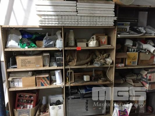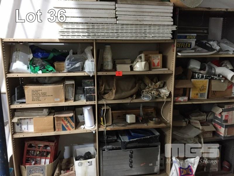SHELF UNIT, MODULAR STEEL , 3 BAY & CONTENTS, LIGHTING, HESSIAN BAGS, PIE WARMER