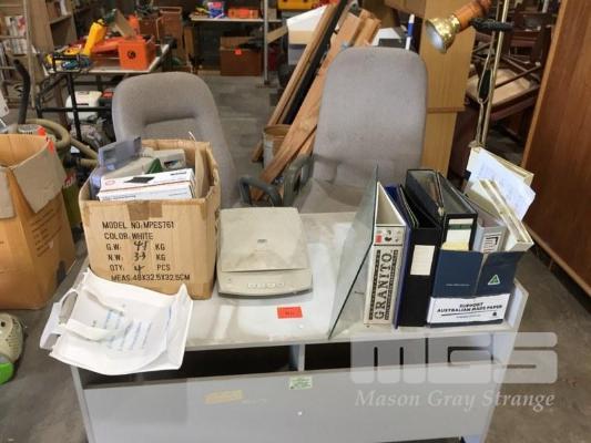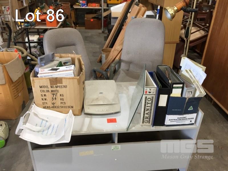 TIMBER LAMINATE DESK, 2 x OFFICE CHAIRS & LAMP