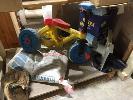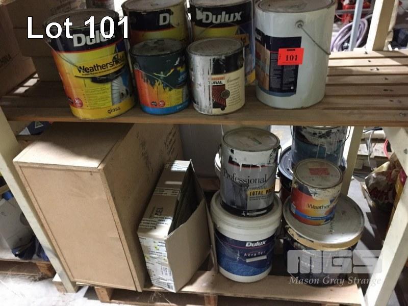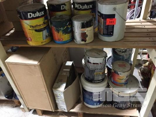 ASSORTED INTERIOR & EXTERIOR PAINT, 6 x ROLLS BUILDERS WATERPROOFING, 2 x EKSYS, BOOKS, WET WEATHER GEAR, 1 x BAG PLASTER, 2 x WINDOW SEALS, ETC, INCLUDES RACK