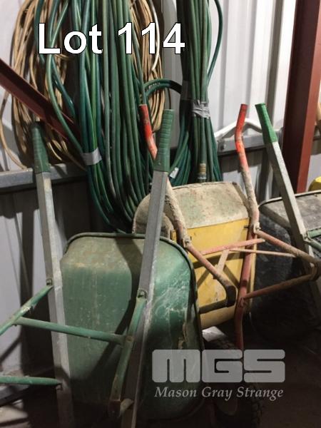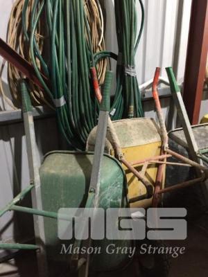2 x WHEELBARROWS, (1 x MISSING WHEEL), ASSORTED HOSE & ELECTRICAL CABLE