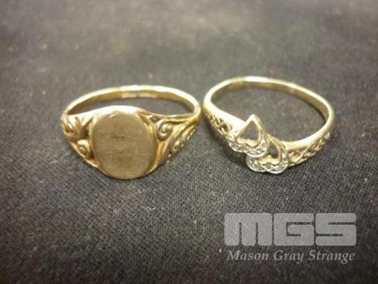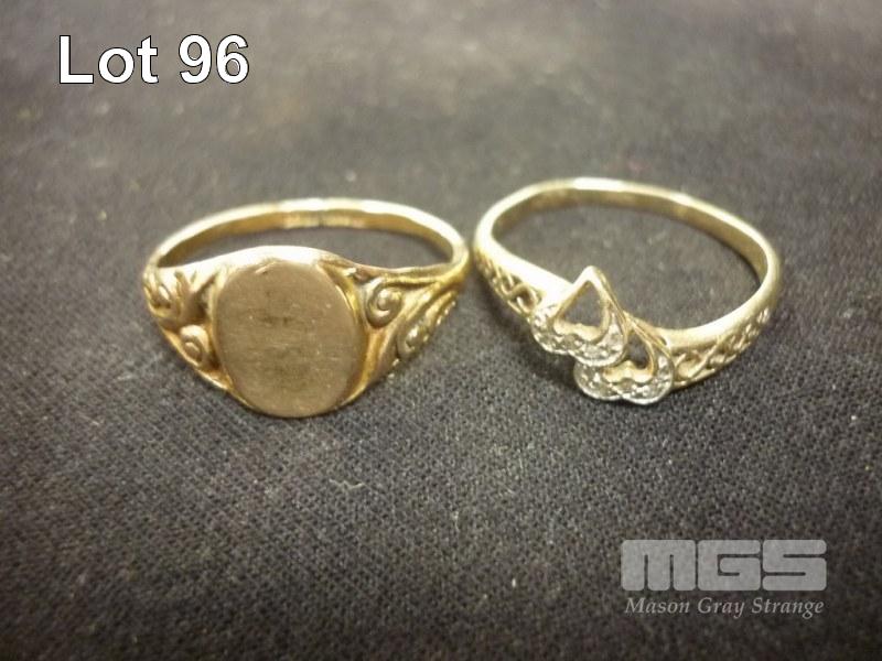 GOLD RING SET WITH SMALL DIAMONDS, MARKED 9K, & GOLD RING, MARKED GOLD SMELT