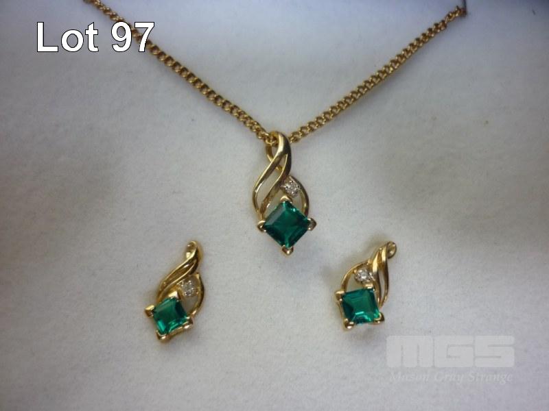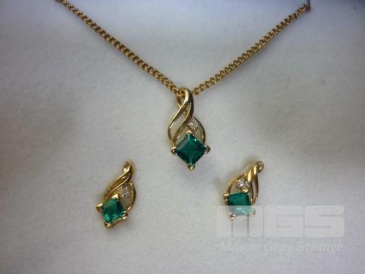 GOLD, EARRINGS & PENDANT SET, SET WITH GREEN EMERALD & SMALL DIAMONDS, MARKED 375 WITH GOLD COLOURED NECKLACE