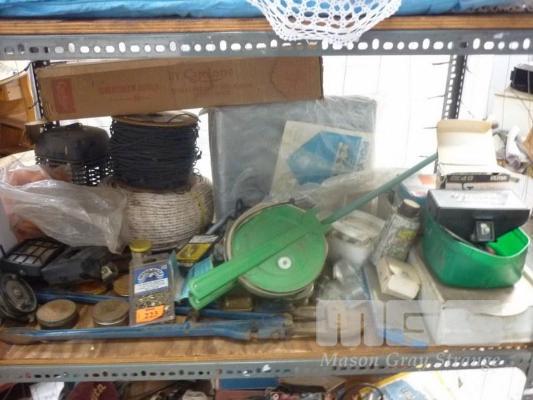 ASSORTED SHED STOCK, TOOLS, ROPE, FITTINGS, ETC