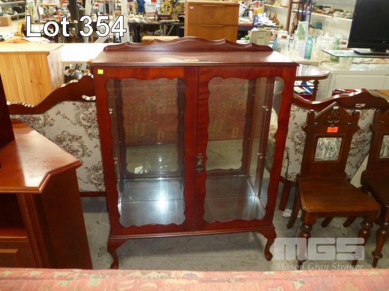 POLISHED TIMBER DISPLAY CABINET, 2 DOOR, MIRROR BACK, 2 x GLASS SHELVES