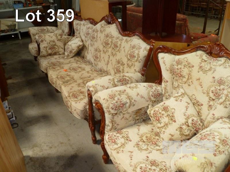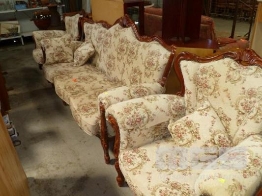 ORNATE CARVED, TIMBER FRAME, FLORAL TAPESTRY UPHOLSTERED, ROLL ARM, 3 PIECE LOUNGE SUITE, 3 SEATER LOUNGE & 2 x SINGLE SEATERS