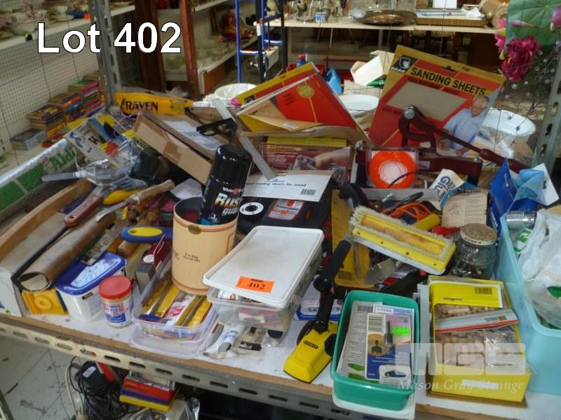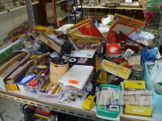 ASSORTED HAND TOOLS, DRILL BITS, TILE CUTTER ETC