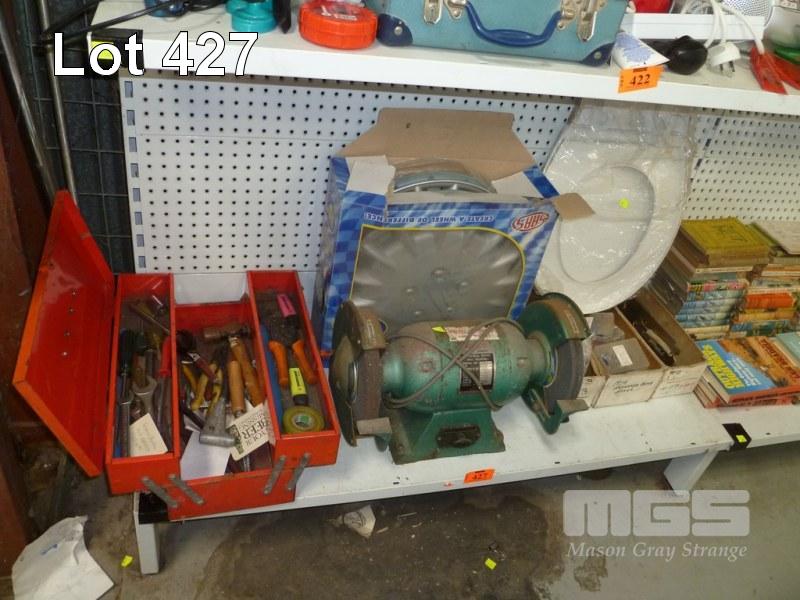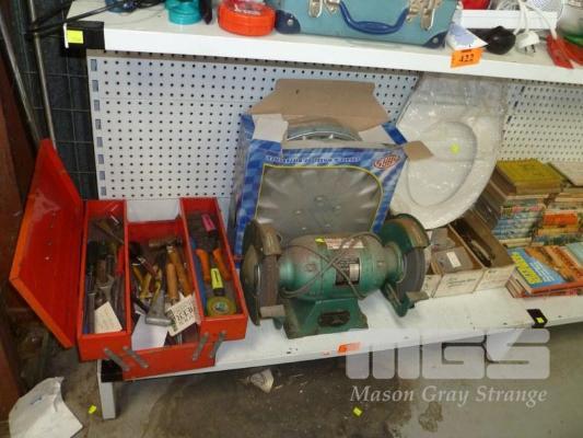 TOOL BOX, BENCH GRINDER, WHEEL TRIMS, HARDWARE ETC