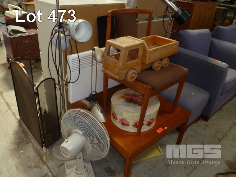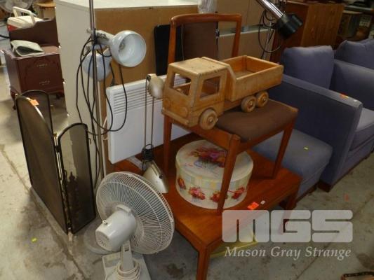 PEDESTAL LIGHTS, HEATER, FAN, COFFEE TABLE, CHAIR ETC