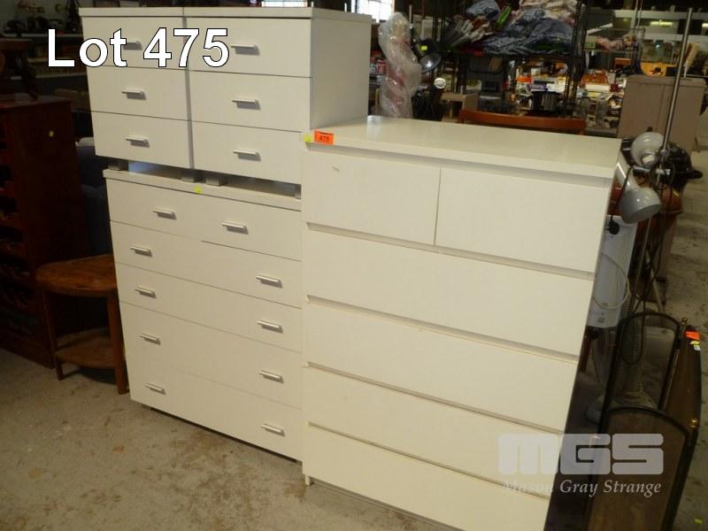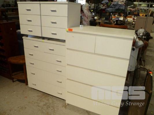 PAIR WHITE MELAMINE BEDSIDE CABINETS, 3 DRAWER, 6 DRAWER TALLBOY & WHITE PAINTED TIMBER TALLBOY, 6 DRAWER
