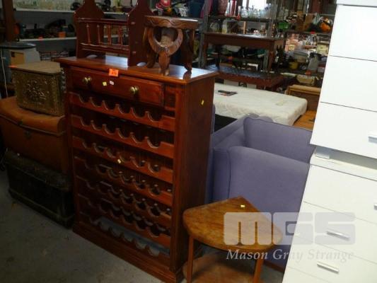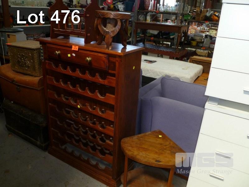 POLISHED TIMBER 42 BOTTLE WINE RACK, MAGAZINE RACK, CORNER TABLE & SMALL STOOL