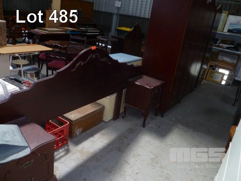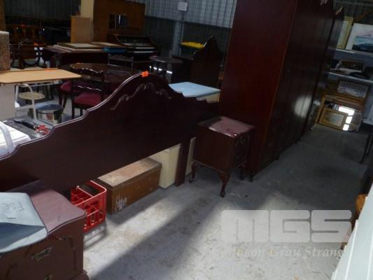 BEDROOM SUITE, ROSEWOOD STAINED FITTED BEDHEAD, 2 x 2 DOOR, 3 DRAWER ROBE & 2 DOOR WARDROBE