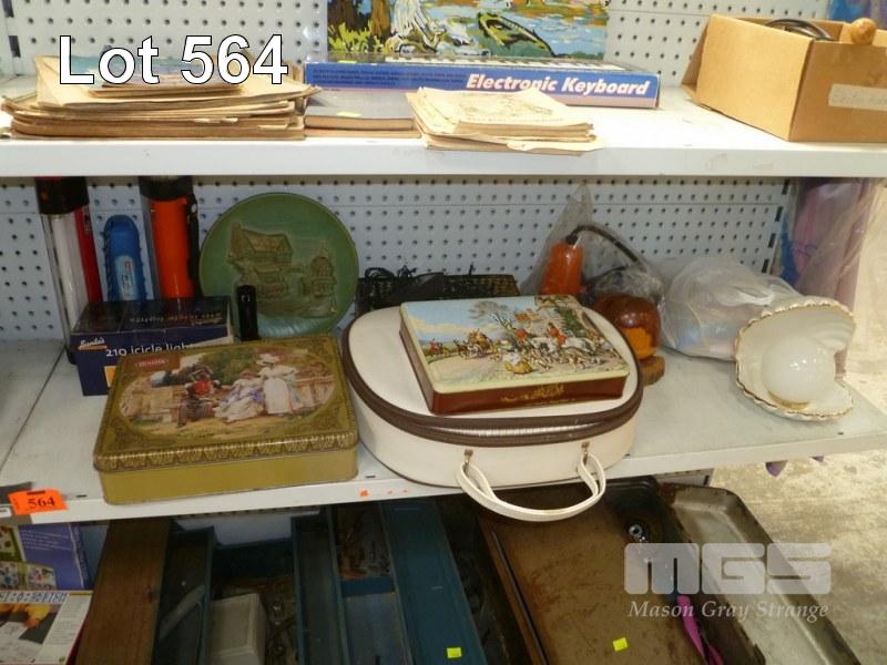 ASSORTED HOUSEHOLD, LAMP, TINS, TORCHES & HAIR DRYER
