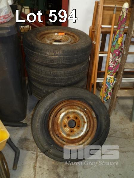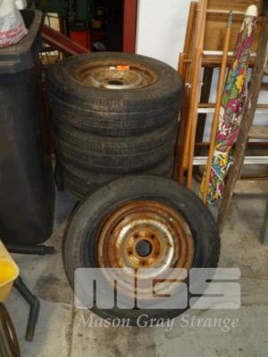 4 x VARIOUS 5 STUD RIMS WITH 3 x ASSORTED 14" TYRES