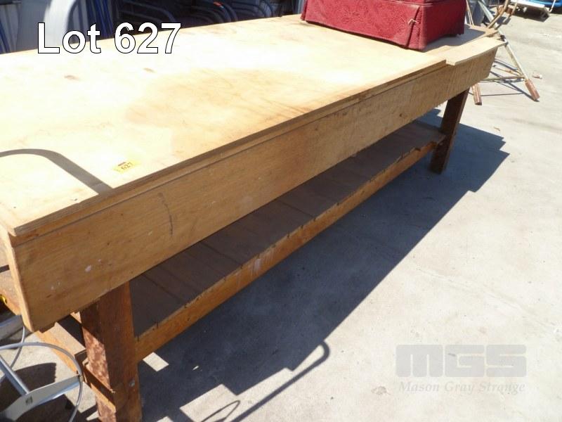 TIMBER WORKBENCH WITH JOINERS VICE APPROX 3 MTR WITH FITTED PLYWOOD TOP