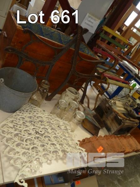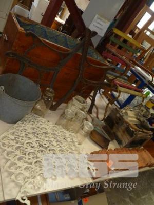 LARGE COLLECTION VINTAGE ITEMS, LACE, SEAT, LARGE BOX, BENCH-ENDS ETC