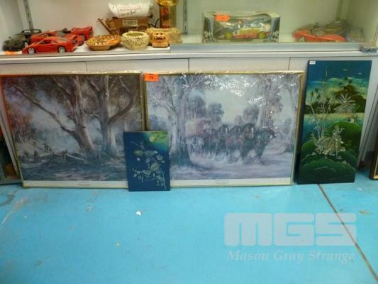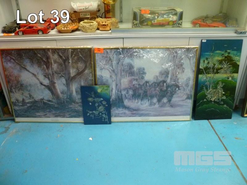 4 X WALL MOUNT ARTWORKS, INC; 2 X VINTAGE ENAMELLED SHELL INLAID, FRAMED PRINT "NOVEMBER HARVEST, MELROSE", 56/500, SIGNED BY TREVOR CLARE & FRAMED PRINT "SINGEING THE STRAINER", 56/500, SIGNED BY ANTON ROSSMAN
