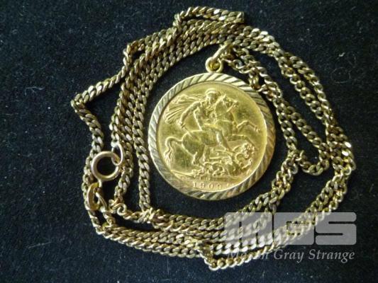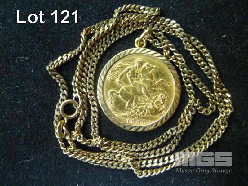 KING EDWARD VI,I 1909, GOLD SOVEREIGN PENDANT, "P" MINT MARK (PERTH) WITH GOLD NECKLACE, MARKED 375, TOTAL WEIGHT 15.86 GRAMS