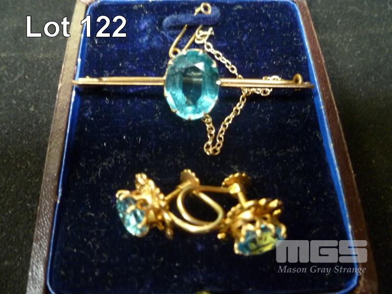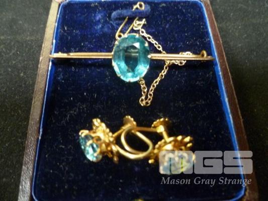 GOLD BROOCH SET WITH CUT BLUE STONE, 9 CT & PAIR OF GOLD EARRINGS SET WITH CUT BLUE STONE, MARK 9CT