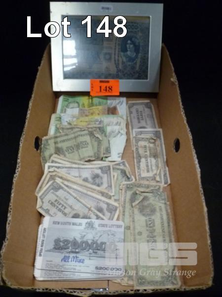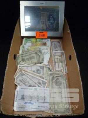 FRAMED 1902, OSZTRAK MAGYAR 1000 KRONER PAPER BANKNOTE, AUSTRALIAN PAPER BANKNOTES, JAPANESE OCCUPATION BANKNOTES, ETC (WORN/TORN)