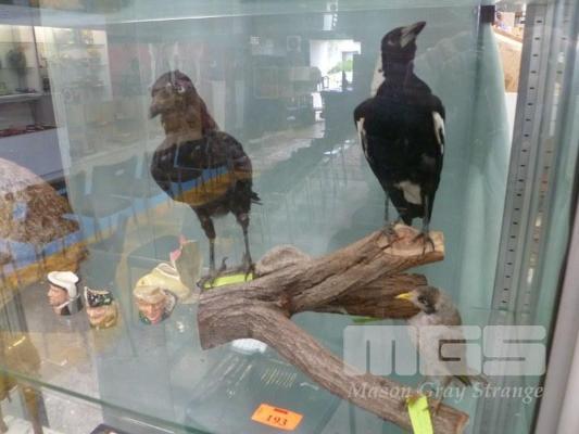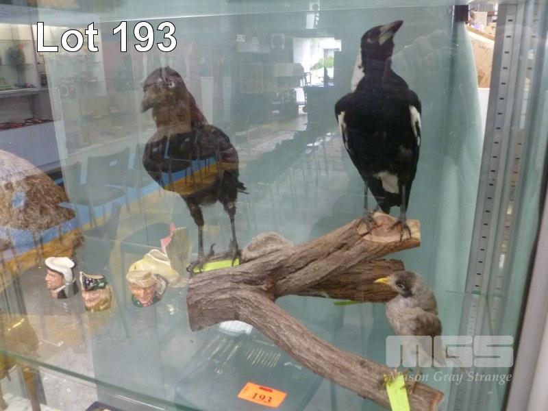 TAXIDERMY CROW, MAGPIE & NOISY MINER MOUNTED ON LOG